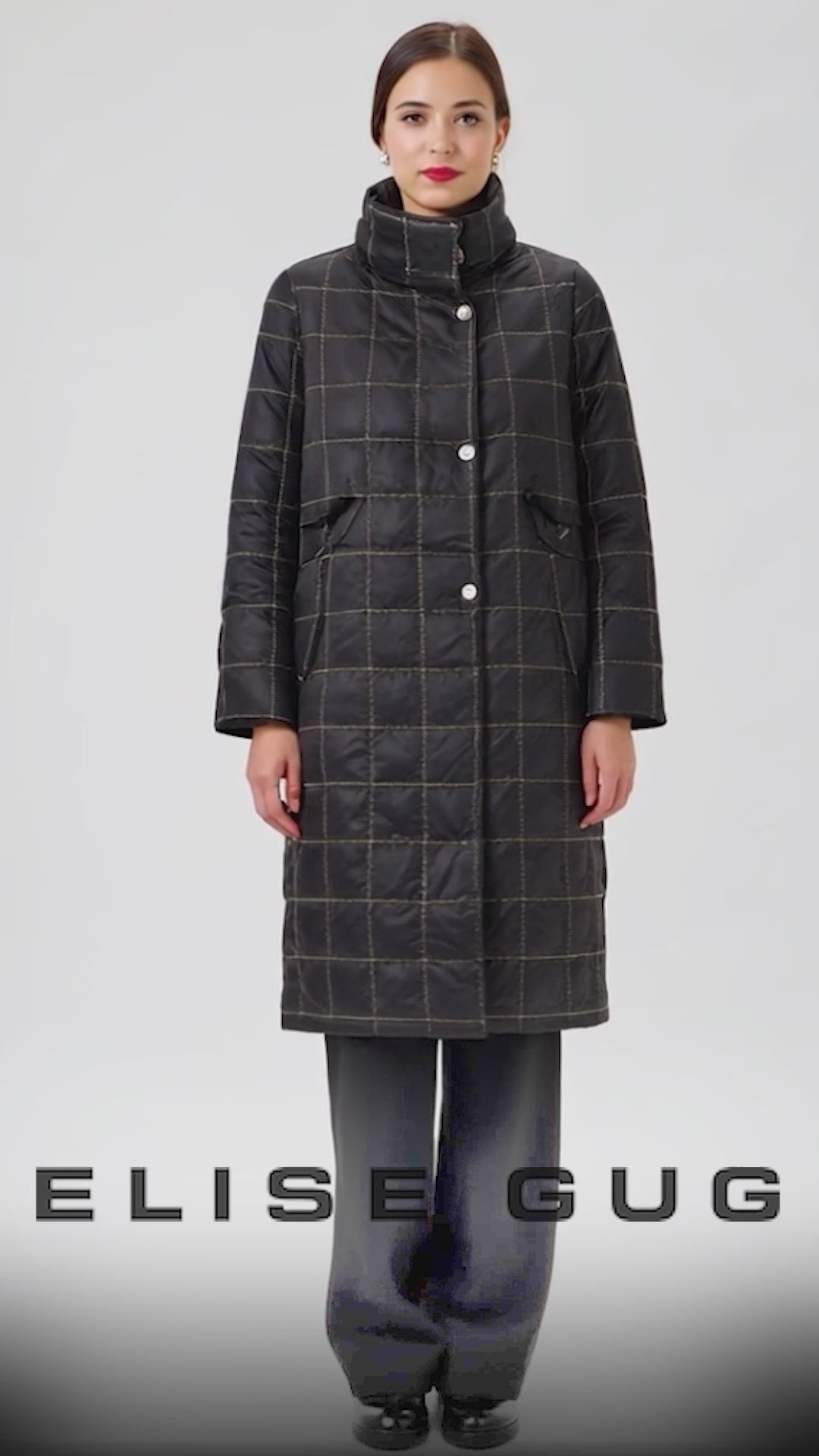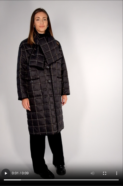 A statement quilted coat crafted from a structured cotton blend, featuring a checked pattern with subtle contrast stitching. Designed with a relaxed fit, large front buttons, and practical pockets, this coat offers warmth and a modern, graphic look. The matching quilted scarf is sold separately.