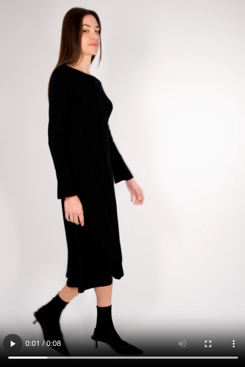 A refined midi dress crafted from pure merino wool, designed with subtle sleeve slit details for a modern, understated touch. Featuring a clean round neckline, tailored upper body, and softly flared skirt, this dress is ideal for both professional and occasion wear.