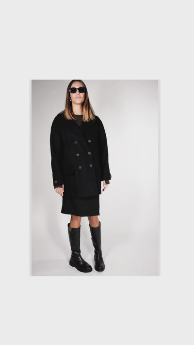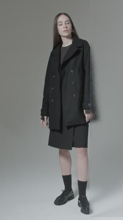 A contemporary interpretation of the classic peacoat, crafted in a warm wool blend (80% Wool, 20% Polyester). The coat features a relaxed silhouette with wide lapels, double-breasted front, and both welt and flap pockets. A timeless outerwear staple designed for both structure and ease.